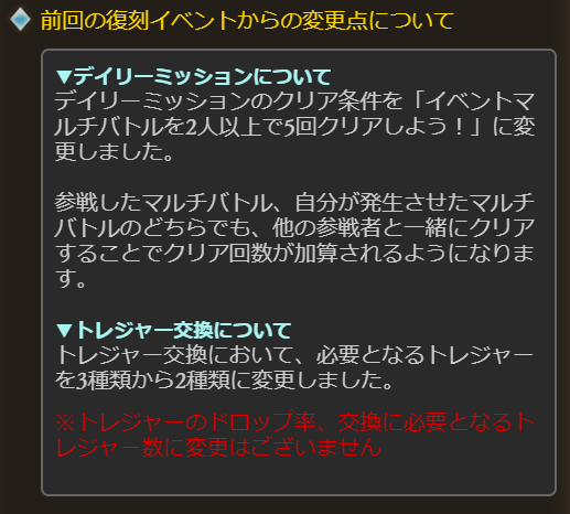 大きくいって2点。一つ目はデイリーミッションが自発でも救援が1人でも入ってたら達成可能に変更。二つ目はトレジャーが3種類から2種類に減少。真ん中のトレジャーだけだだあまりすることがなくなるということらしい。